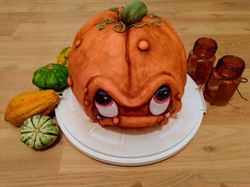 Sie besteht aus 4 unterschiedlich großen Schoko-Kürbiskuchen, einer Fruchtfüllung, ganz viel Ganache und einem Überraschungskern aus Smarties. Überzogen und Dekoriert und gefärbten Fondant, Lebensmittelfarbstiften und -pulvern.